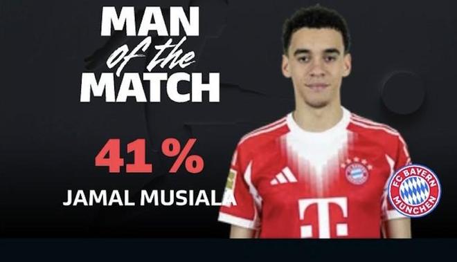 最终经过德甲官网球迷投票,穆西亚拉以41%的得票率力压路易斯-迪亚斯(29%),当选全场最佳球员。